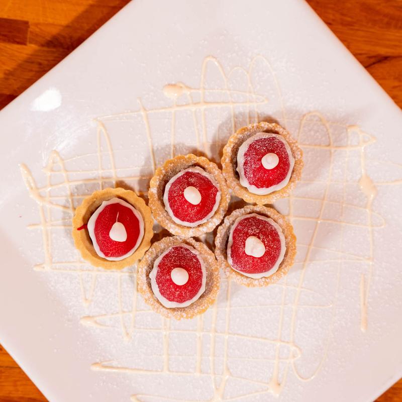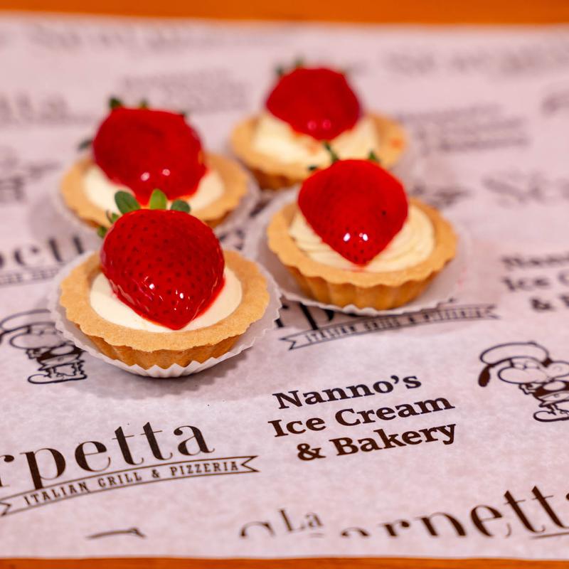 A variety of tarts filled with either cream cheese, mascarpone, or vanilla custard, topped with different fruits.