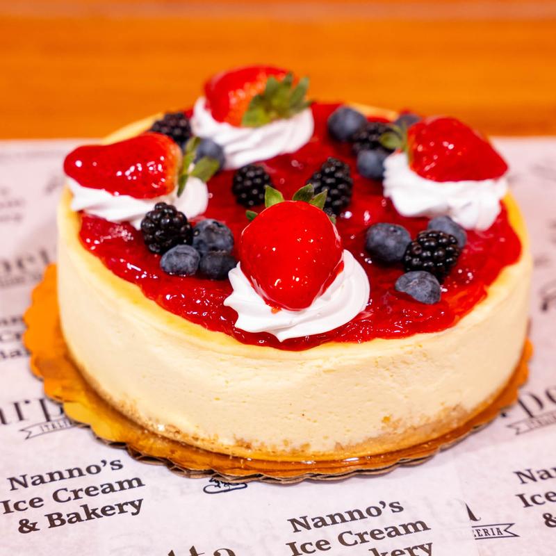 New York style cheesecake with a strawberry filling as a topping along with a variety of fruits.
