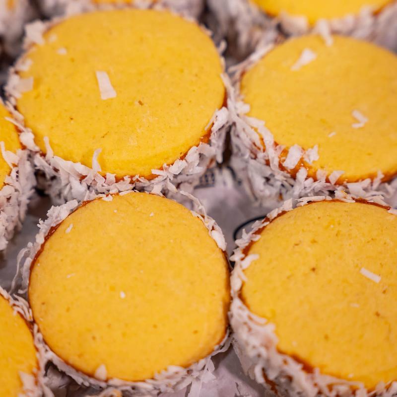 Two soft cornstarch cookies filled with dulce de leche rolled on coconut flakes.