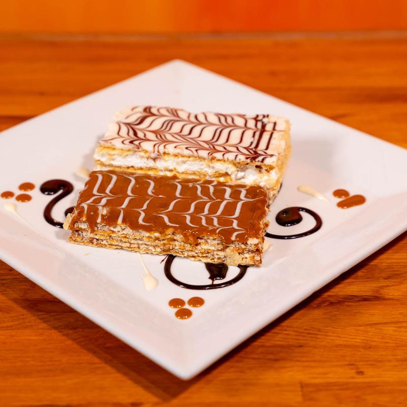 Vanilla cake with a dulce de leche mousse filling topped with a milk chocolate ganache.